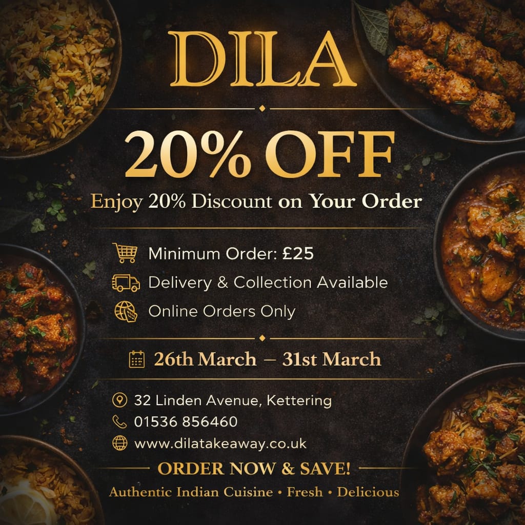 We are proud to present the finest chef in the culinary world. The management takes great care to ensure that our diners are happy with the food. We pride ourselves on our customer service and quality of food. DILA TAKEAWAY uses only the very best ingredients to prepare your meal. In addition to the all time favourite dishes, we also offer our own specialities creating unique meals for you to enjoy. DILA TAKEAWAY is an Authentic Cuisine in KETTERING, tempted by an unrivaled range of Authentic & Imaginative traditional and fusion dishes. Our approach to healthy cooking is that we try to minimize additives in our dishes. So enjoy your meal & have a memorable experience!!